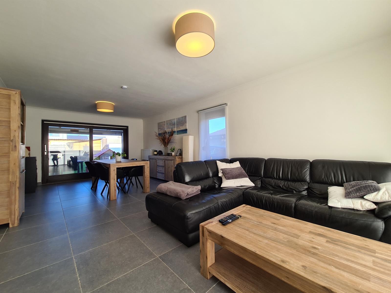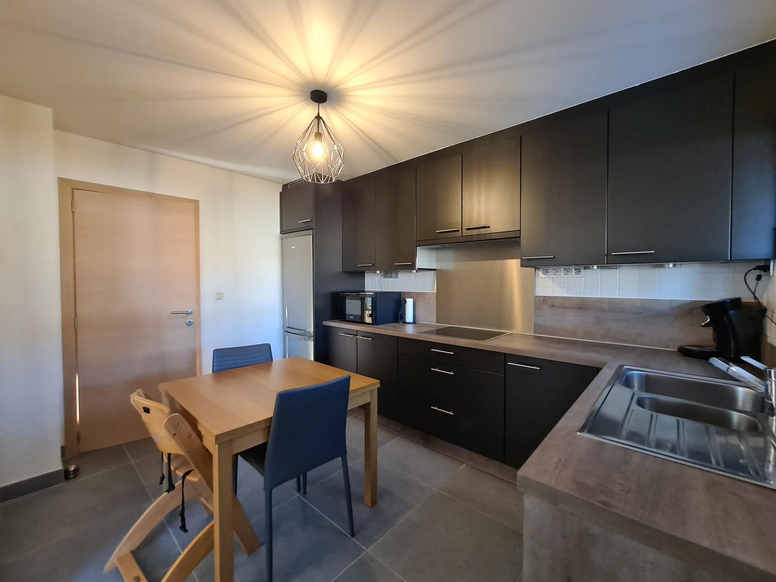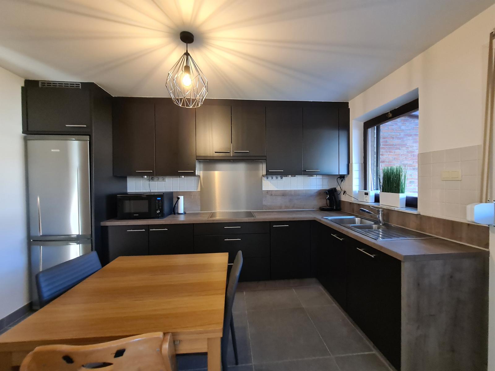We komen de woning binnen langs de ruime inkomhal die toegang geeft tot de keuken en de woonkamer. De woonkamer is voorzien van grote raampartijen waardoor er veel natuurlijk licht binnenkomt. De keuken is volledig ingericht en voorzien van alle comfort.